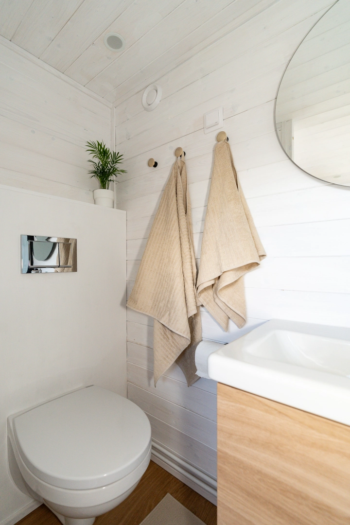 Pientalomme on varustettu kaikilla tarvittavilla liitännöillä. Vakioratkaisu sisältää vesi- ja sähköliitännän. On mahdollista asentaa myös vesivessa tai kompostikäymälä.